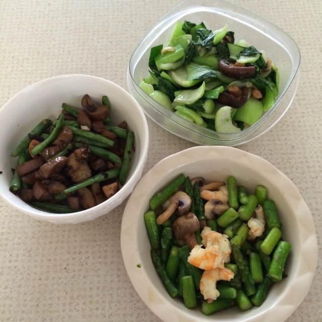 芦笋炒虾仁,青菜炒香菇,茄子炒豆角。开始晚餐断淀粉类主食控制体重!
