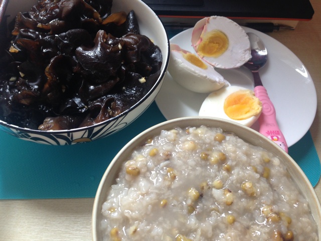 凉拌木耳,绿豆粥,鸭蛋,半个鸡蛋,撑死我了