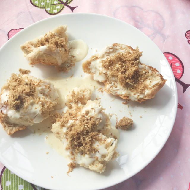 用卡仕达酱蘸了吐司🍞,外面蘸了肉松,诡异的味道,可能是肉松味大…
