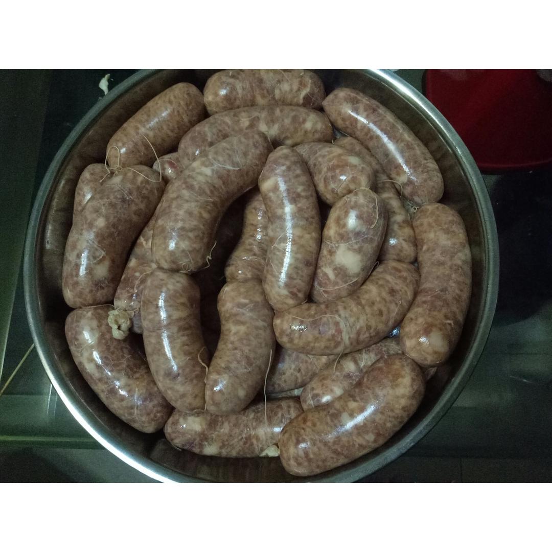 前几天做的广式腊肠,中午吃了点,味道很不错,就是颜色不红润,肠衣太粗了,等吃完了用羊肠衣再做点。