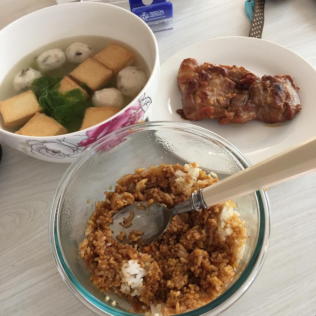 一个人的午饭,照烧汁多煮了些,拿来拌饭吃,美味!