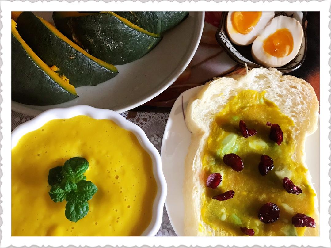 南瓜牛油果开放三明治、南瓜汤、蒸南瓜