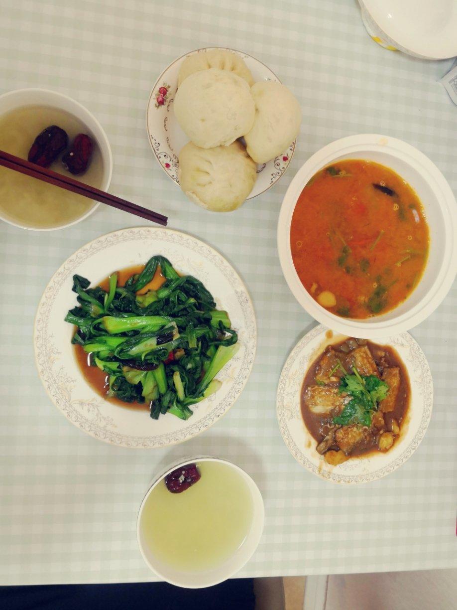 红烧带鱼,西红柿牛腩,清炒油菜,藜麦小米大米汤,非常好吃哟。