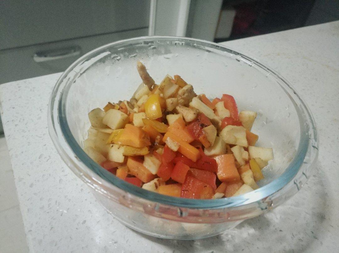 原料:胡萝卜,莲藕,彩椒,鸡胸肉
