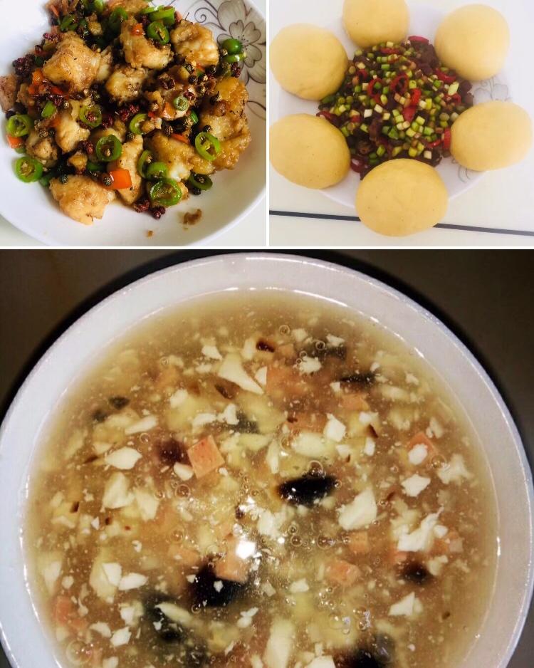 晚餐:香煎龙利鱼、窝头+炒三丁、皮蛋豆花汤