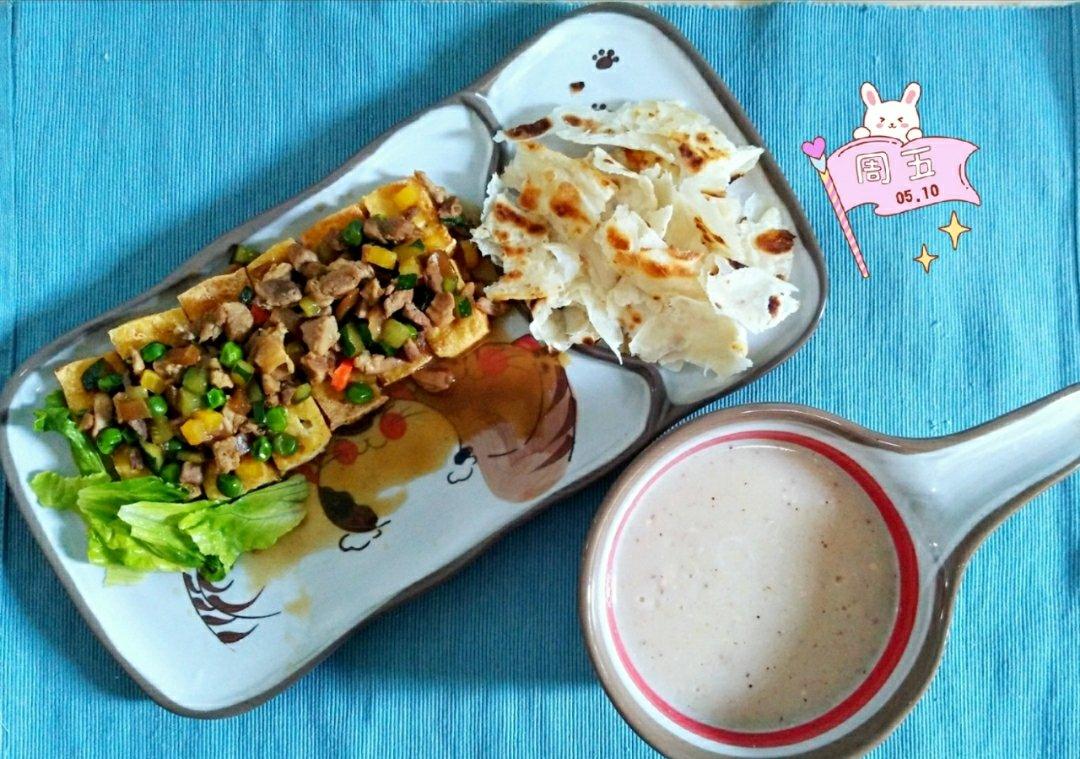 青豆肉末浇汁儿煎豆腐,手撕饼,米糊