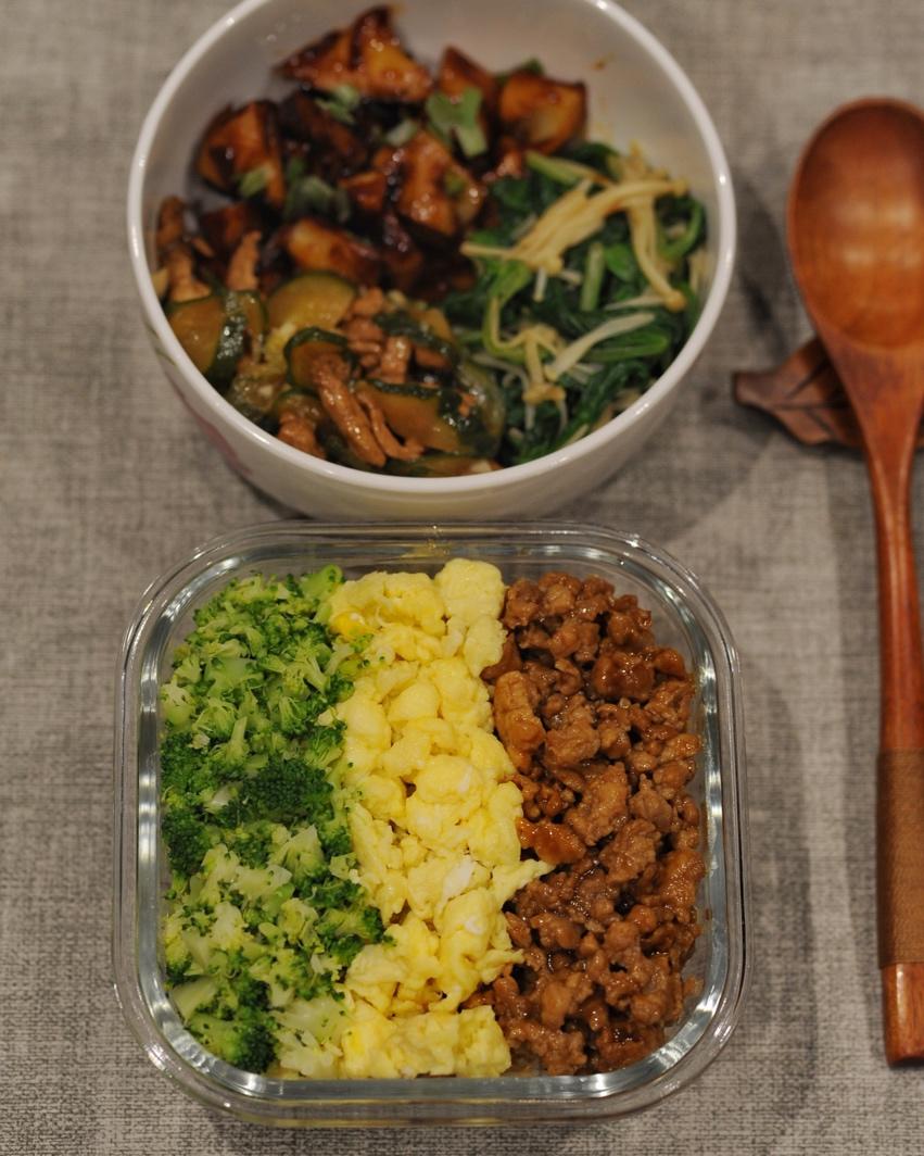 鸡肉末、鸡蛋末、西兰花末,用小一点的饭盒装载“三色末末末盖饭”,尽管减少了用量,也能吃出饱腹满足感,假装自己吃多了;藕丁裹满了亮盈盈的糖醋汁儿,可以餐前开胃~