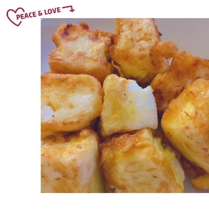 牛奶冻成形之后裹了生粉和蛋液,然后下锅炸的,有点腻嘿嘿就没有吃完,第二次热了热吃起来竟然不腻了~