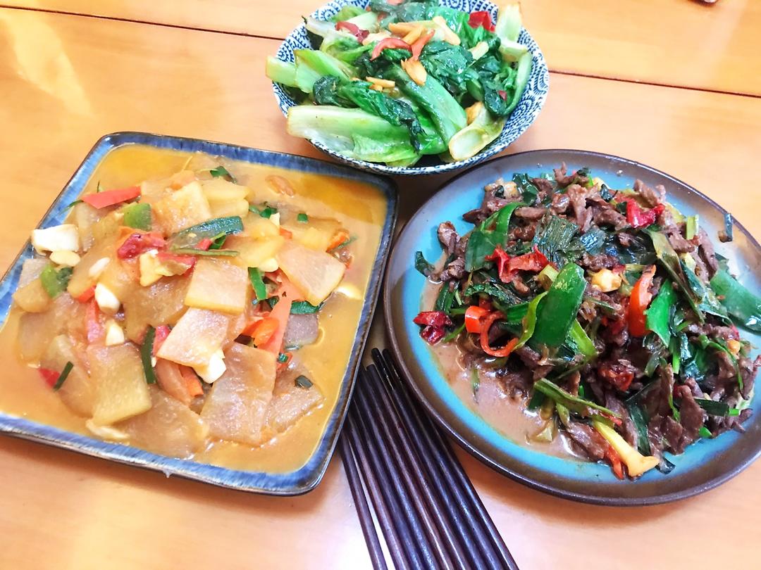 U小妞的快手早餐 做过 午餐•2020年1月30日 今天中午终于有青菜了,大分量的牛肉丝炒蒜苗➕红烧冬瓜➕炒生菜,这几日宅在家里准备3大两小的一日三餐,深刻体会到了家庭主妇的各种不易,一年的做饭额度估计要在这个春节超额用完了😅😅😅#午餐•2020年1月30日# 2020-01-30