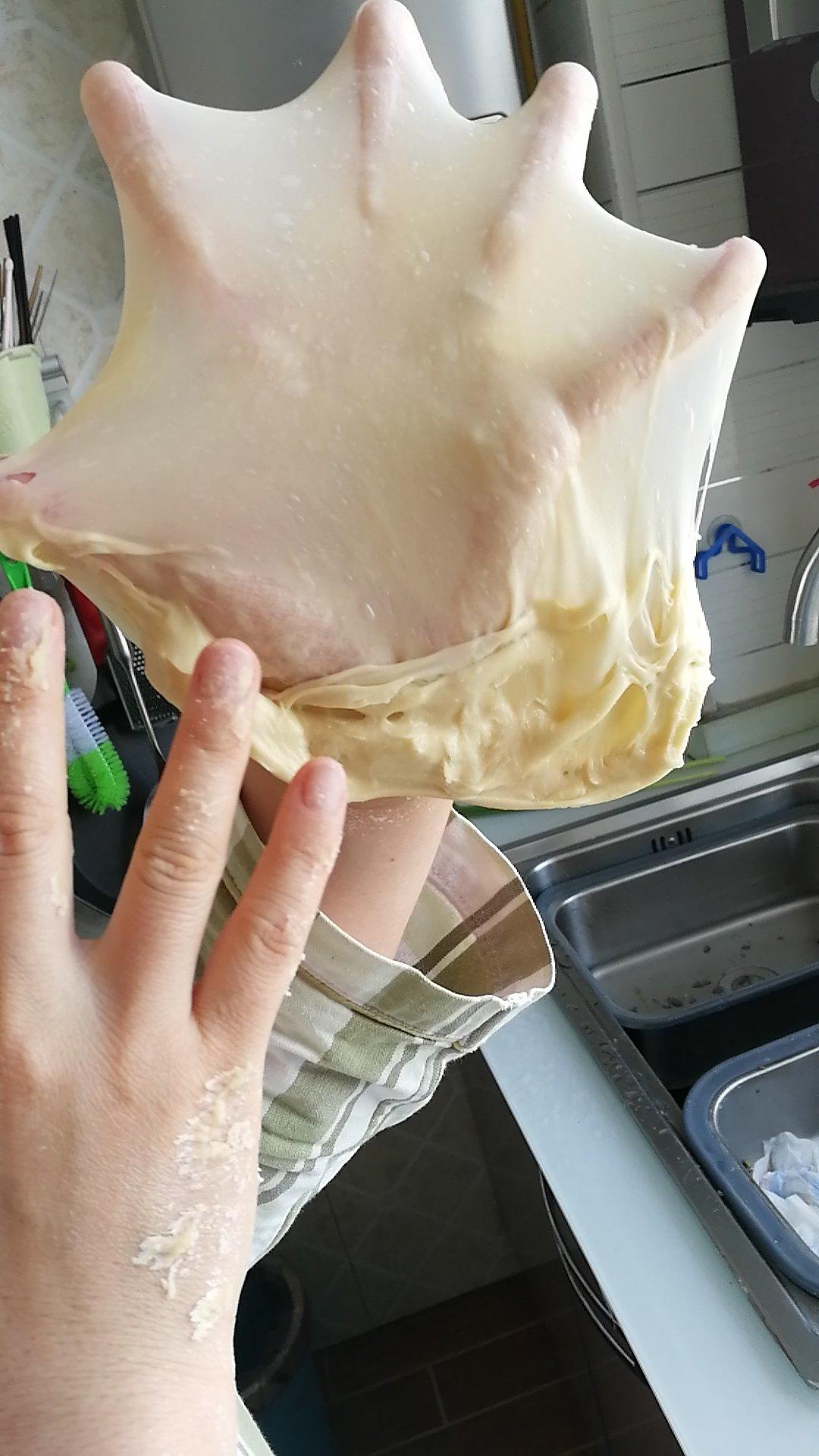 有才妈-1 做过 【干货】隔夜冷藏法轻松快速手揉手套膜🍞超简单 教作业,冷藏13小时吧,拿出来没有多少膜,然后手工半小时就是这个状况了,比我第一次摔打一个多小时还没出这种膜轻松多了 2020-04-14