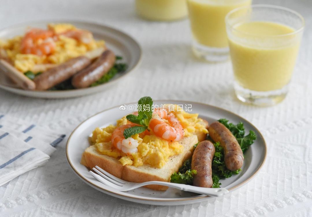 滑蛋虾仁+自制黑胡椒玉米脆皮肠+玉米汁