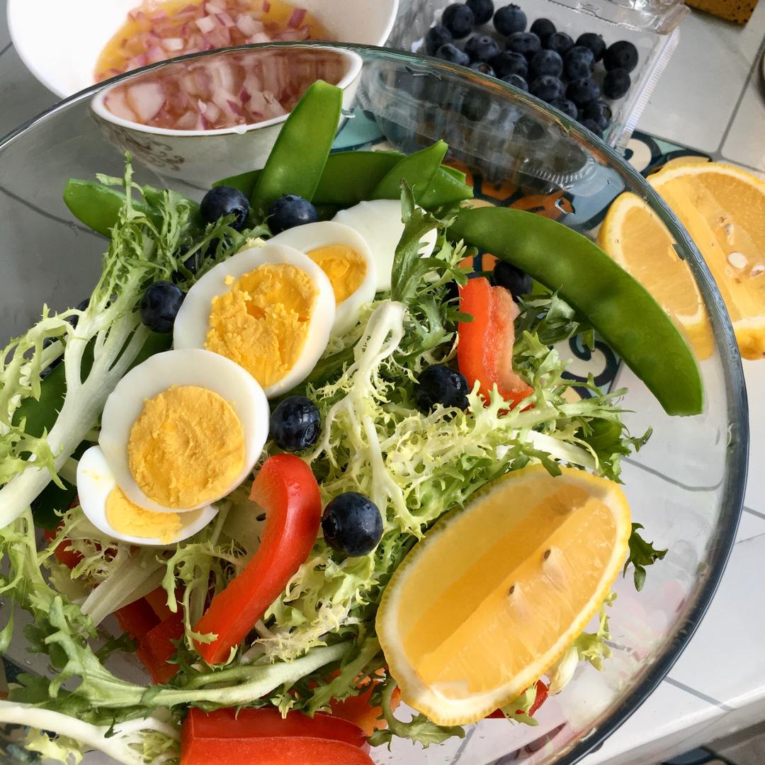 #早餐•2020年5月6日#今天中午吃草,下面是红薯胡萝卜打底,随便调了个油醋汁,加了一点柠檬汁,好香!本来有牛肉的,昨晚没拿出来解冻🤦🏻♀️就明天吃牛肉好了嘿嘿