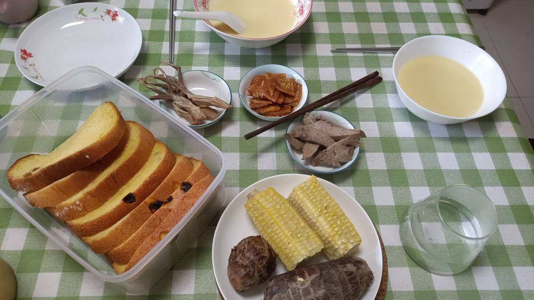 奶香玉米汁/芋头/南瓜面包/腌萝卜/糟鸭舌/糟猪肝凑成的一顿早餐