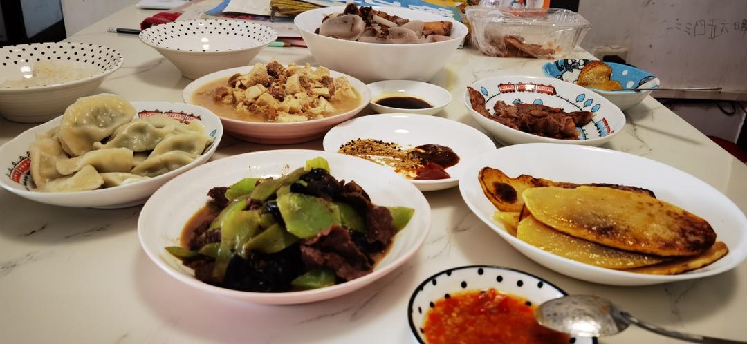 周日午餐:莴笋木耳炒牛肉,煎土豆片,鲅鱼饺,孜然瘦肉,肉沫烧豆腐,骨头汤滚白萝卜。