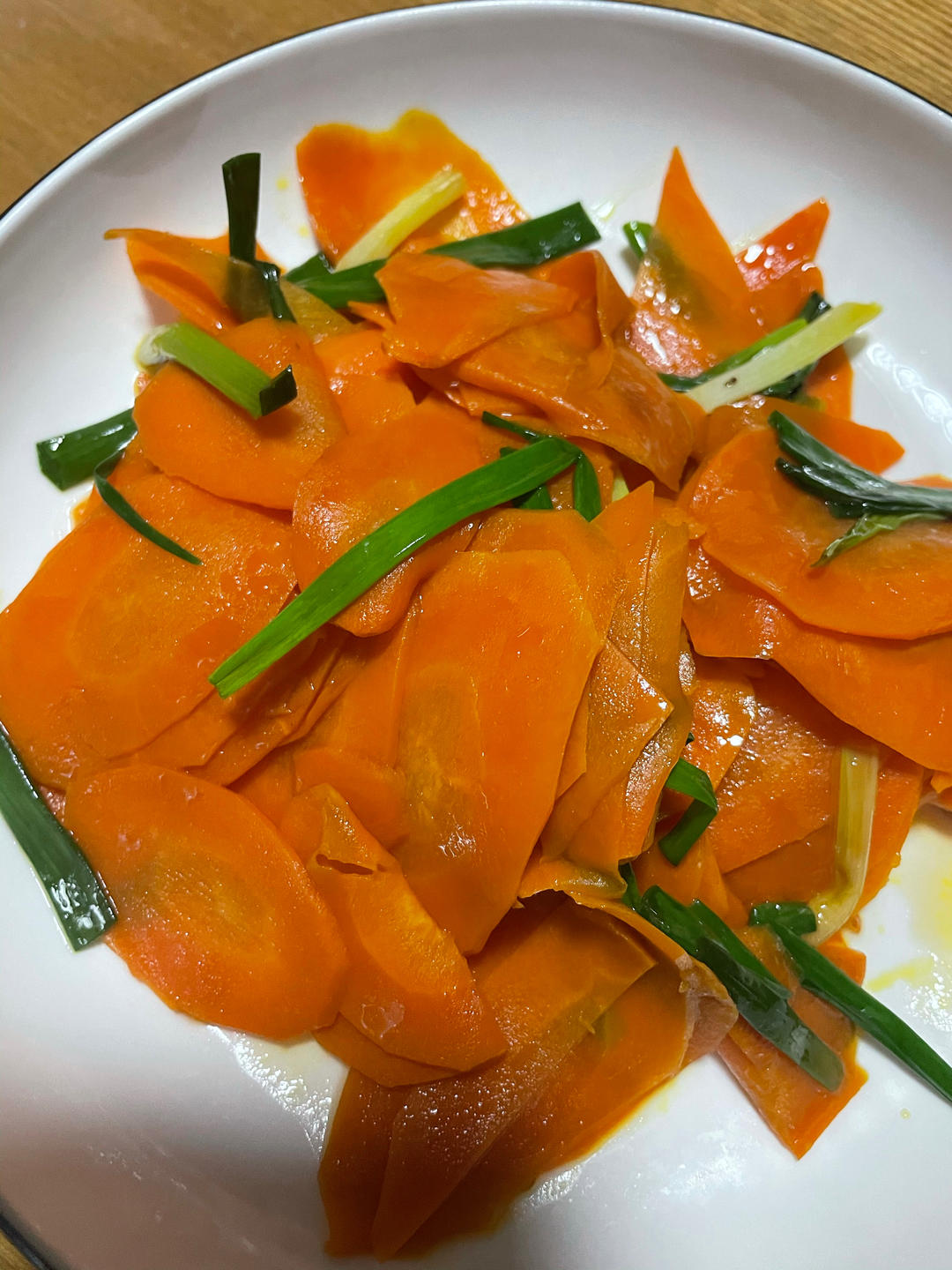 胡萝卜切片加油炒软,下葱白炒出香味,加盐、生抽、少许水翻炒,出锅前撒葱段。复刻了妈妈的味道!