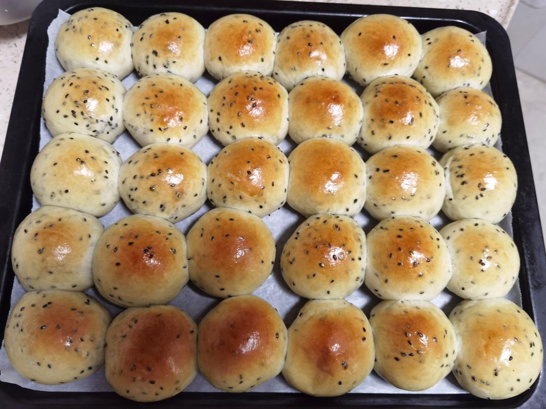 半夏的漫食光 做过 2023年11月12日 没有黄油了,210克牛奶,50克玉米油,80克全蛋液,6克酵母粉,440克高筋面粉,45克糖,4克盐一起放面包机揉面3个来回,最后剩下4分钟时候加入一大把黑芝麻揉均匀,分为30等份,揉圆入烤箱发酵60分钟左右,上下火180℃烤25分钟。 2023-11-12
