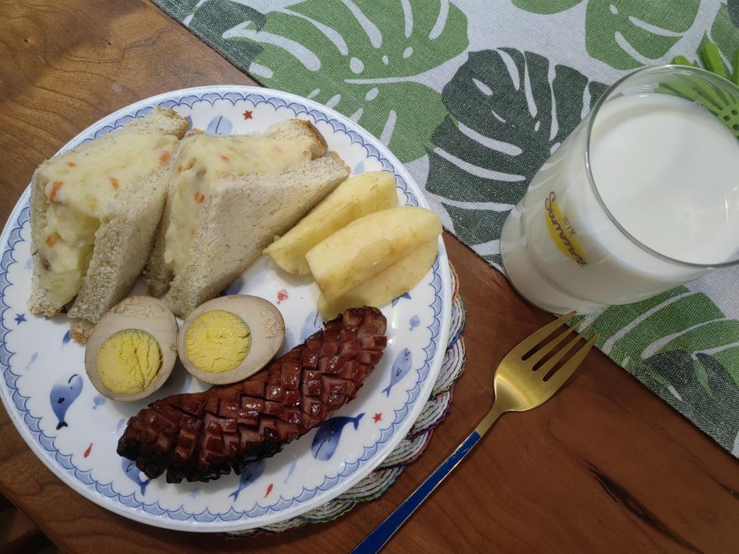 土豆泥三明治,熏蛋,烤香肠,牛奶,苹果