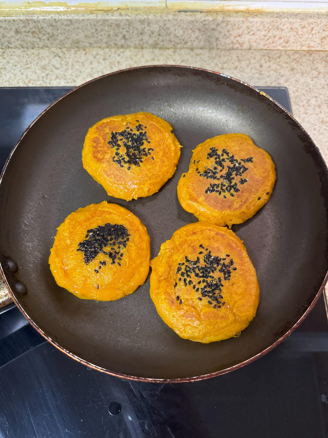 无糖南瓜饼,用平底锅煎的。只是我的饼边上一圈太黏了,是不是含水量有点多呀?