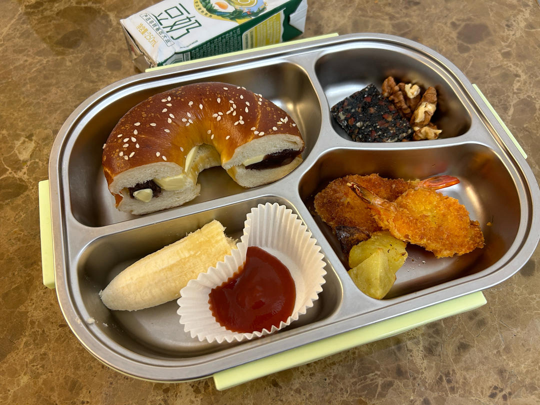 早餐 贝果,凤尾虾,核桃芝麻派,香蕉