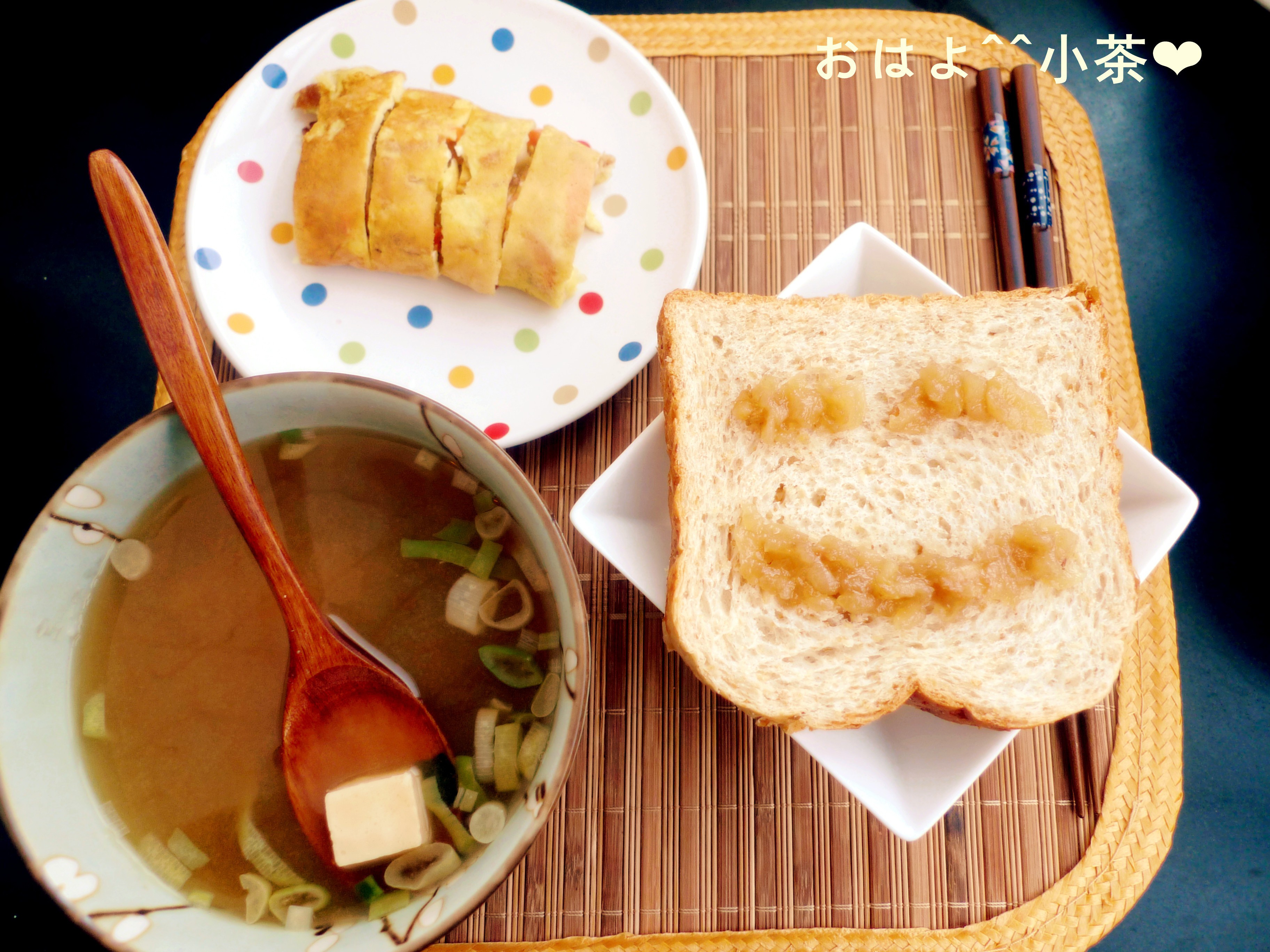 20111130。玉子烧,味增汤,全麦土司,自制果酱。土司先森表示他想顺便卖个萌~~^_^