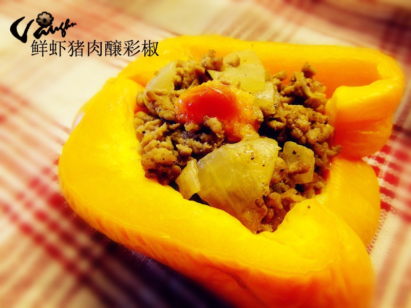 >3<Vaughn 做过 鲜虾猪肉酿彩椒 宿舍只剩一個彩椒 分成兩半 和室友一人一半了 沒有蝦 哈哈 所以換了洋蔥 加點蔬菜更健康哈 剩下一點魚子醬就撒到中間 再點上一滴番茄醬啦. 2013-05-16
