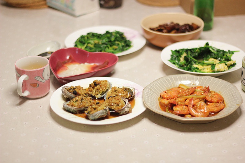 蒜蓉蒸鲍鱼、茄汁大虾、北极贝、韭菜炒鸡蛋、红烧肉、清炒菠菜,再来点小酒,吃撑了