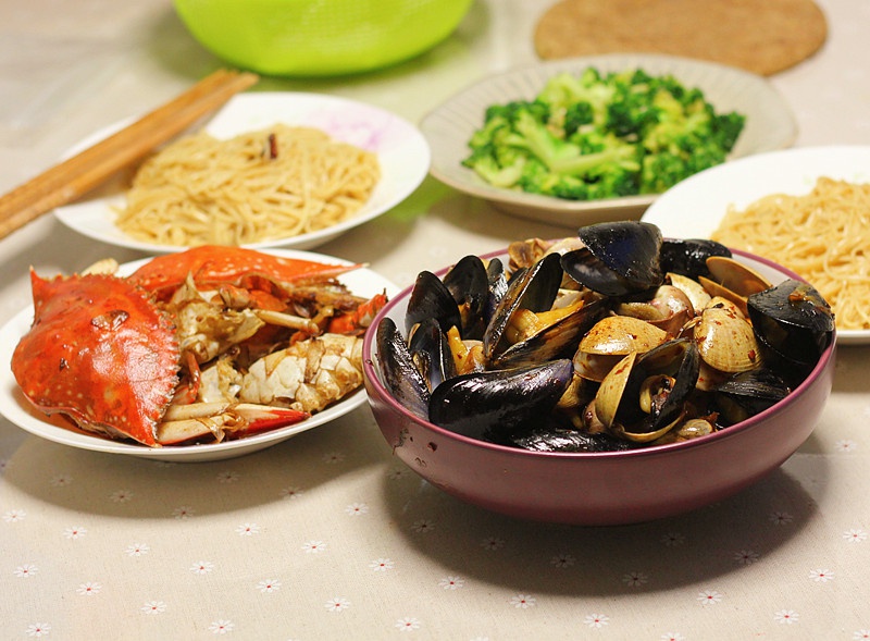 姜葱蟹、辣炒贝壳、西兰花、葱油面。次海鲜啦~