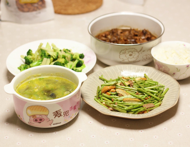 上汤丝瓜、笋干菜烧肉、芦蒿炒香干肉丝、蒜蓉西兰花