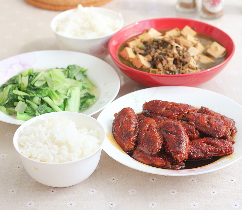 貌似是我的经典搭配了,红烧鸡翅、肉末豆腐、炒青菜,时间紧就在鸡翅上划两刀