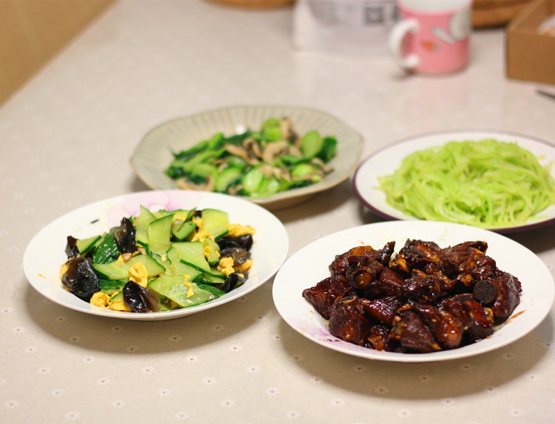 糖醋排骨、木须肉、清炒莴笋、蘑菇炒青菜