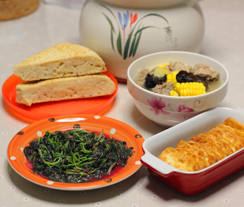 蒜蓉苋菜、玉米排骨汤、煎豆腐,配饼吃
