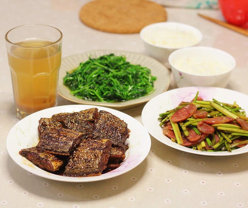 红烧带鱼、蒜苗炒腊肠、清炒豌豆尖