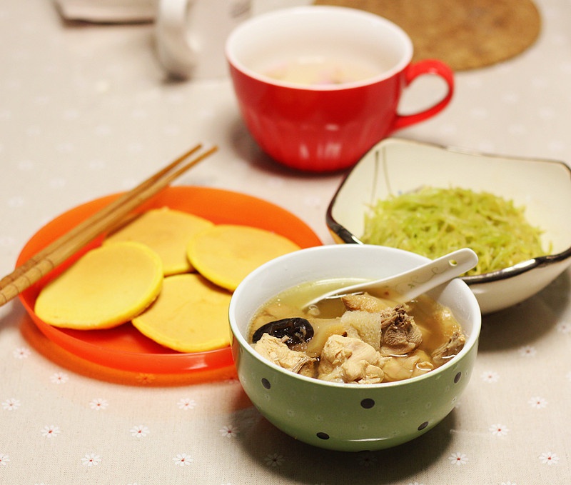 剩的鸡汤,拌个小凉菜,就着玉米饼,又是一餐啦