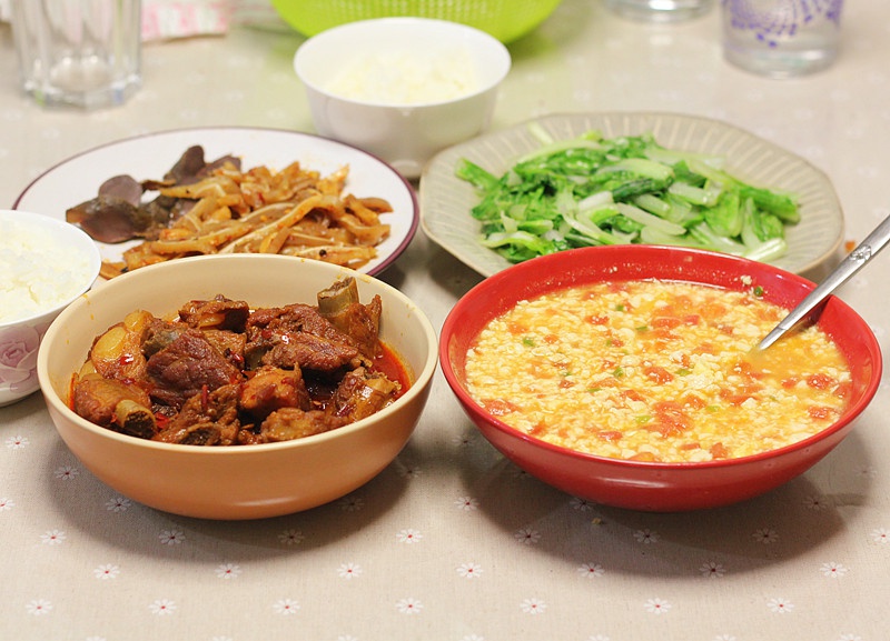 红烧排骨、番茄豆腐羹、清炒小白菜、昨天打包的凉菜。在楼下小菜店买的排骨,骨头好粗,肉也不好吃,第一次体会到了猪肉也能有这...