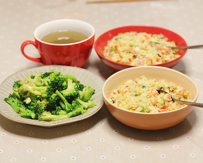 炒饭、西兰花、绿豆汤,简单的一餐