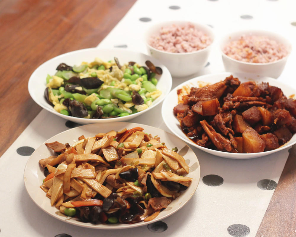 去年的存图……鱼香肉丝、蔬菜杂炒、土豆牛肉焖饭,皮蛋豆腐颜值有点拉胯给它放后面虚化掉吧……