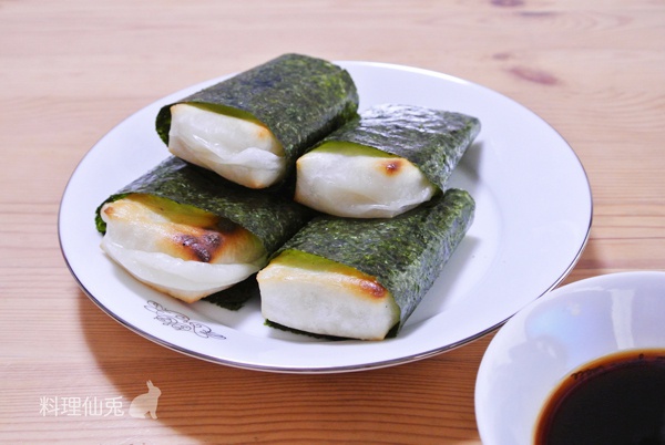 喜欢吃脆的海苔所以包好了再沾甜酱油。(也可以烤好年糕马上沾甜酱油,再包海苔,就湿漉漉的)