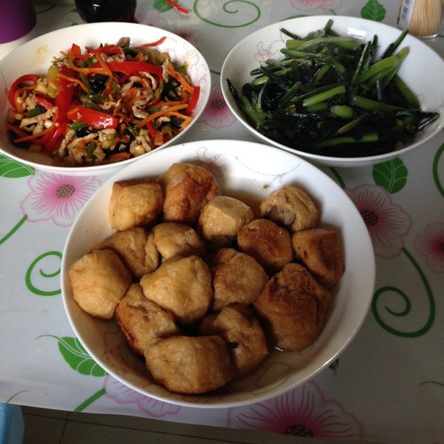 摆盘太没注意以后多照文艺美照~鱼香肉丝+油豆腐肉馅丸+红菜苔~yummy