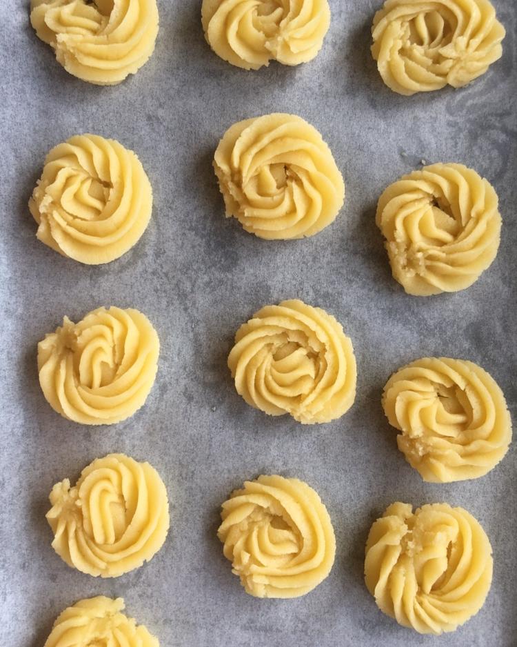 第二次用这个方子做黄油曲奇。细砂糖没融化,颗粒感比较明显。糖放多了,味道偏甜。面团不够软,黄油有点难挤。还用了冷藏的蛋黄...
