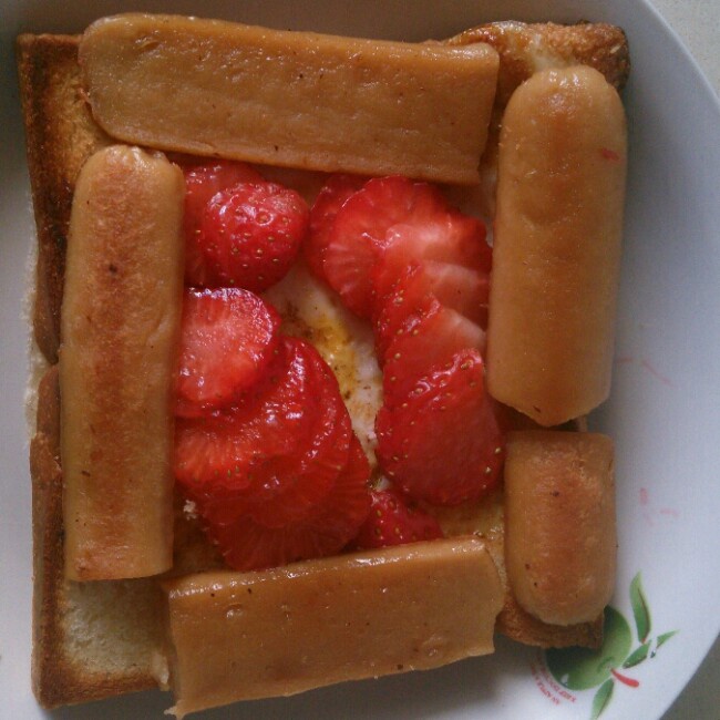 看家里还有些剩余土司,火腿,草莓,鸡蛋。自己随意搭配了一下,名字就叫草莓土司吧!