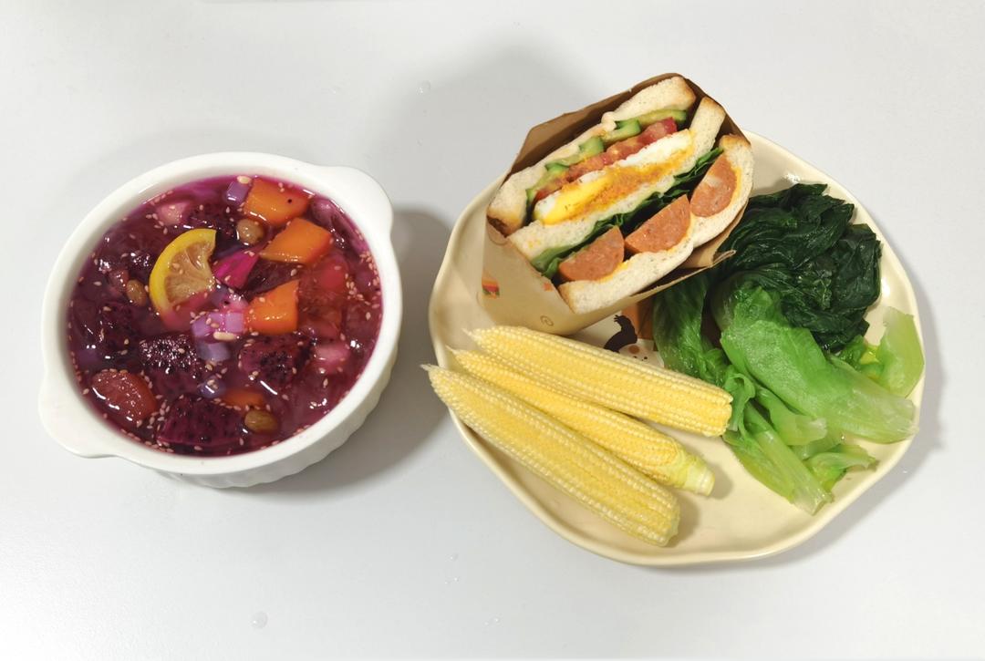 三明治+青菜+玉米笋+水果冰粉