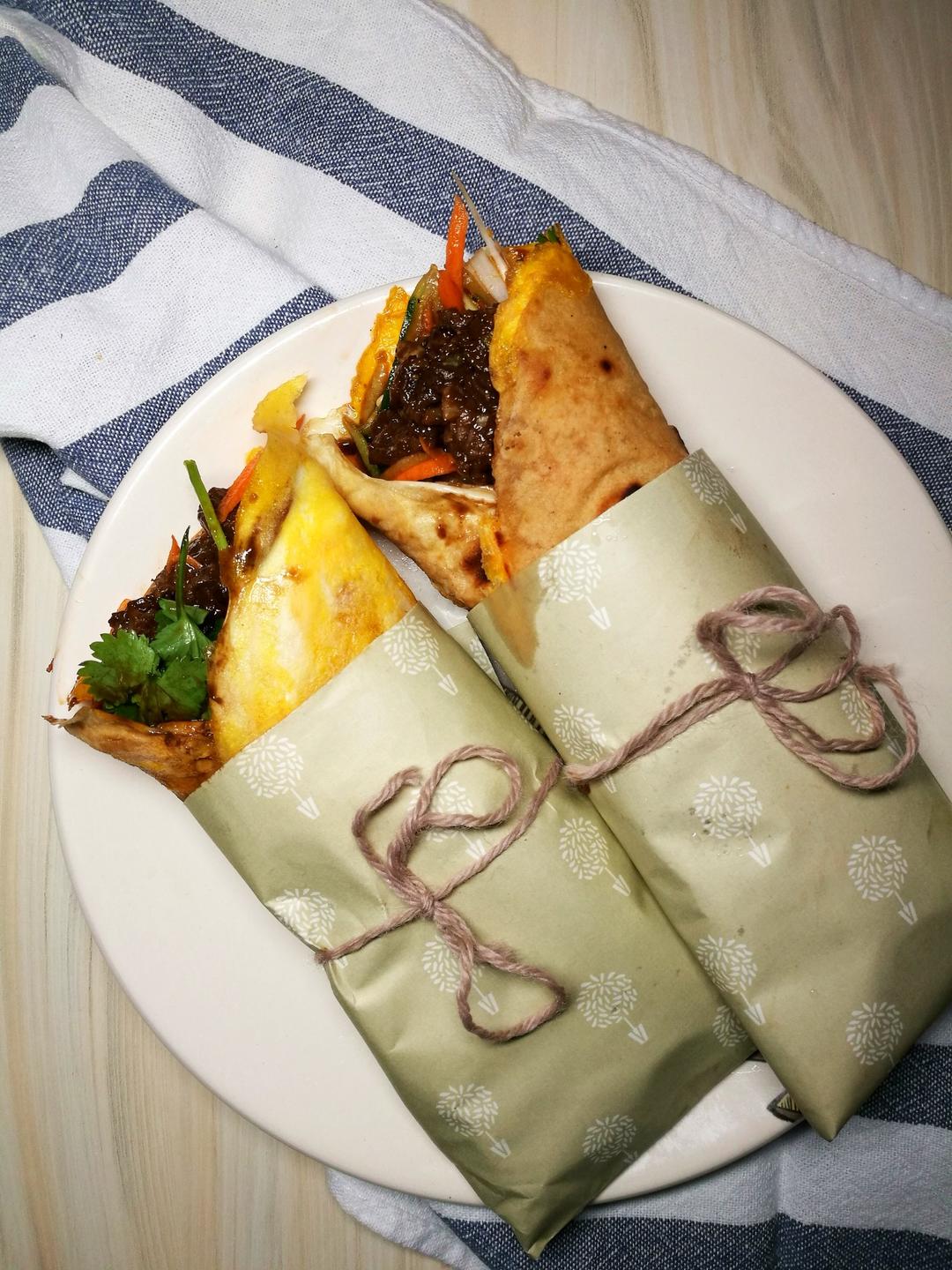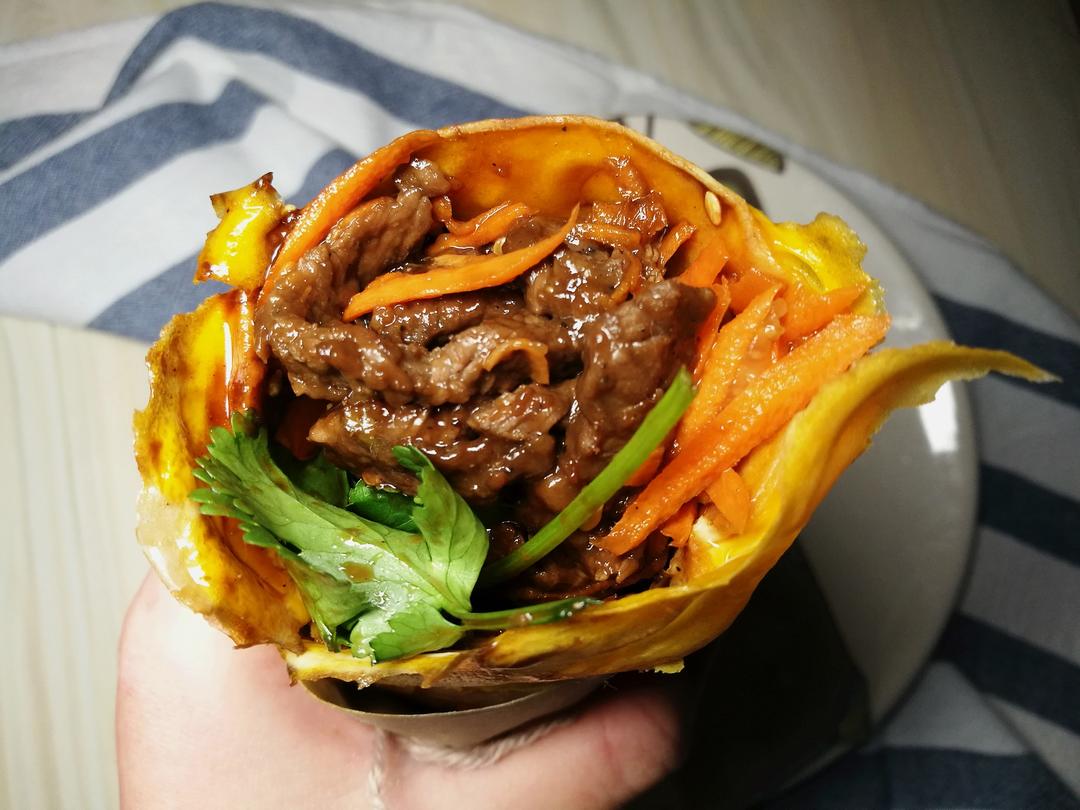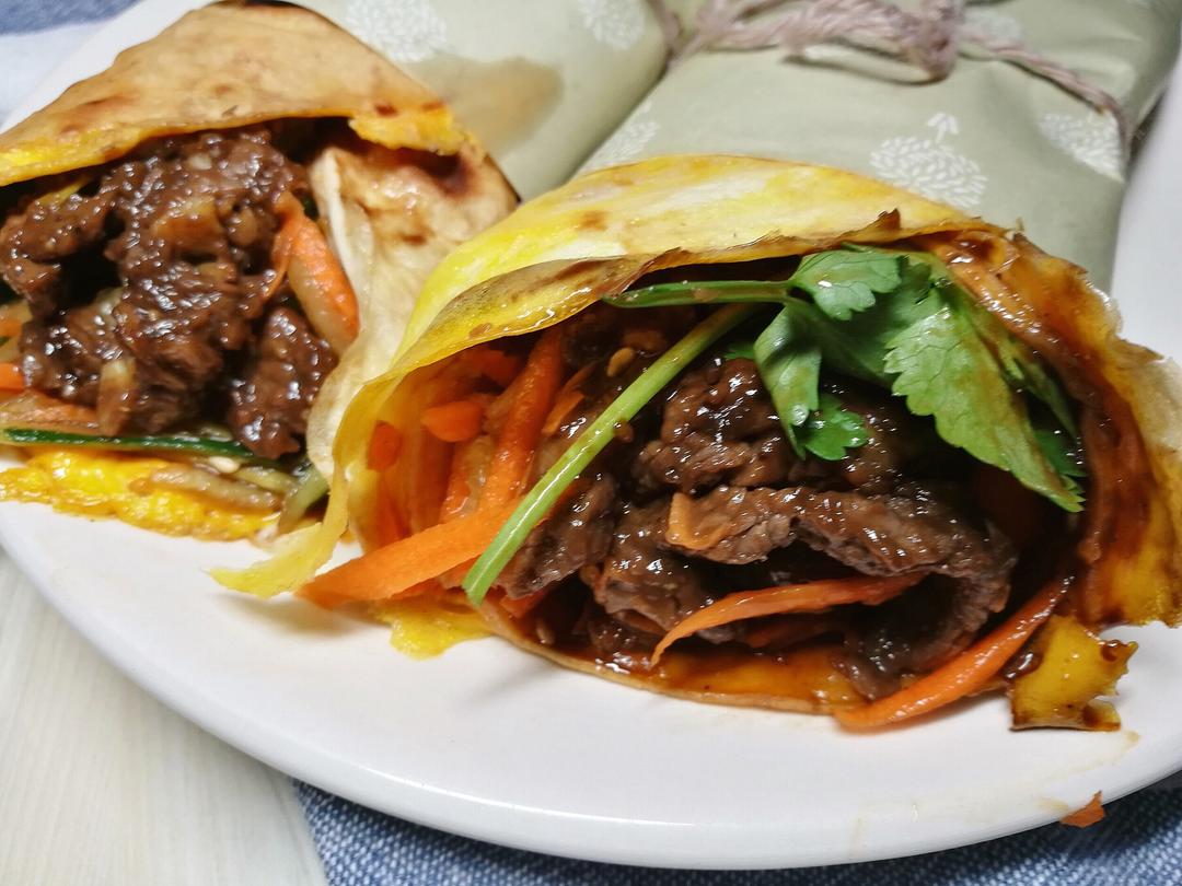 京酱肉丝卷饼,家里剩了很多牛肉就用牛肉代替了猪肉。而...