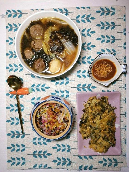 今日晚餐:紫菜牛肉丸汤、香椿炒鸡蛋、五色花米...