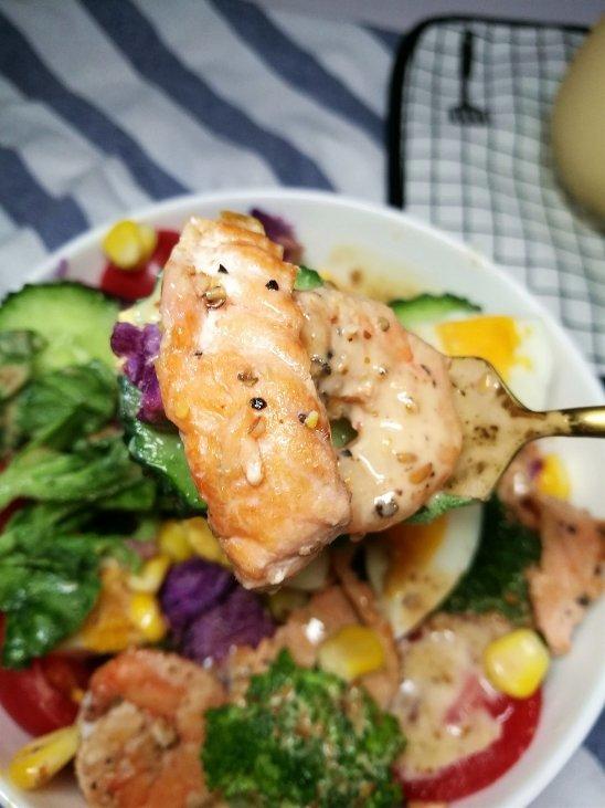 乱入一个菜谱~三文鱼和虾仁用盐和黑胡椒腌制煎熟,还...
