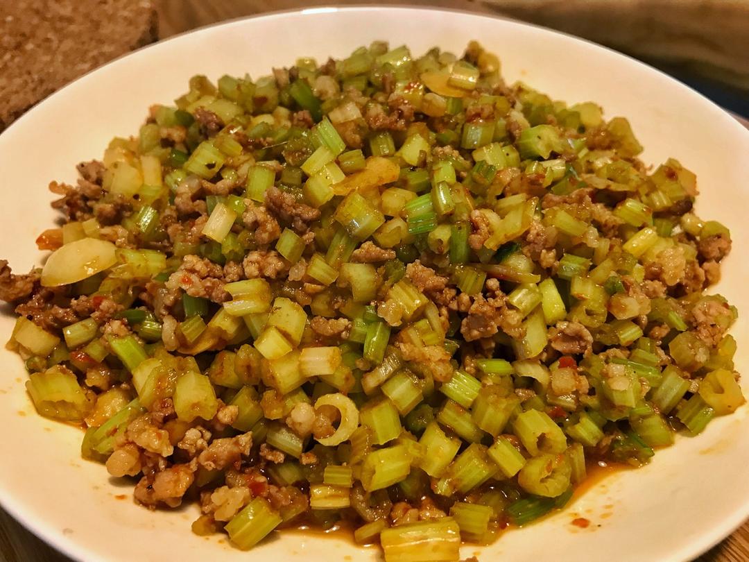 底油下豆瓣爆香,加姜蒜片,下肉末炒至变色,加少许生抽,下芹菜末炒匀,起锅前加一小勺盐。吃不完第二顿还可以当作下面的浇头#...