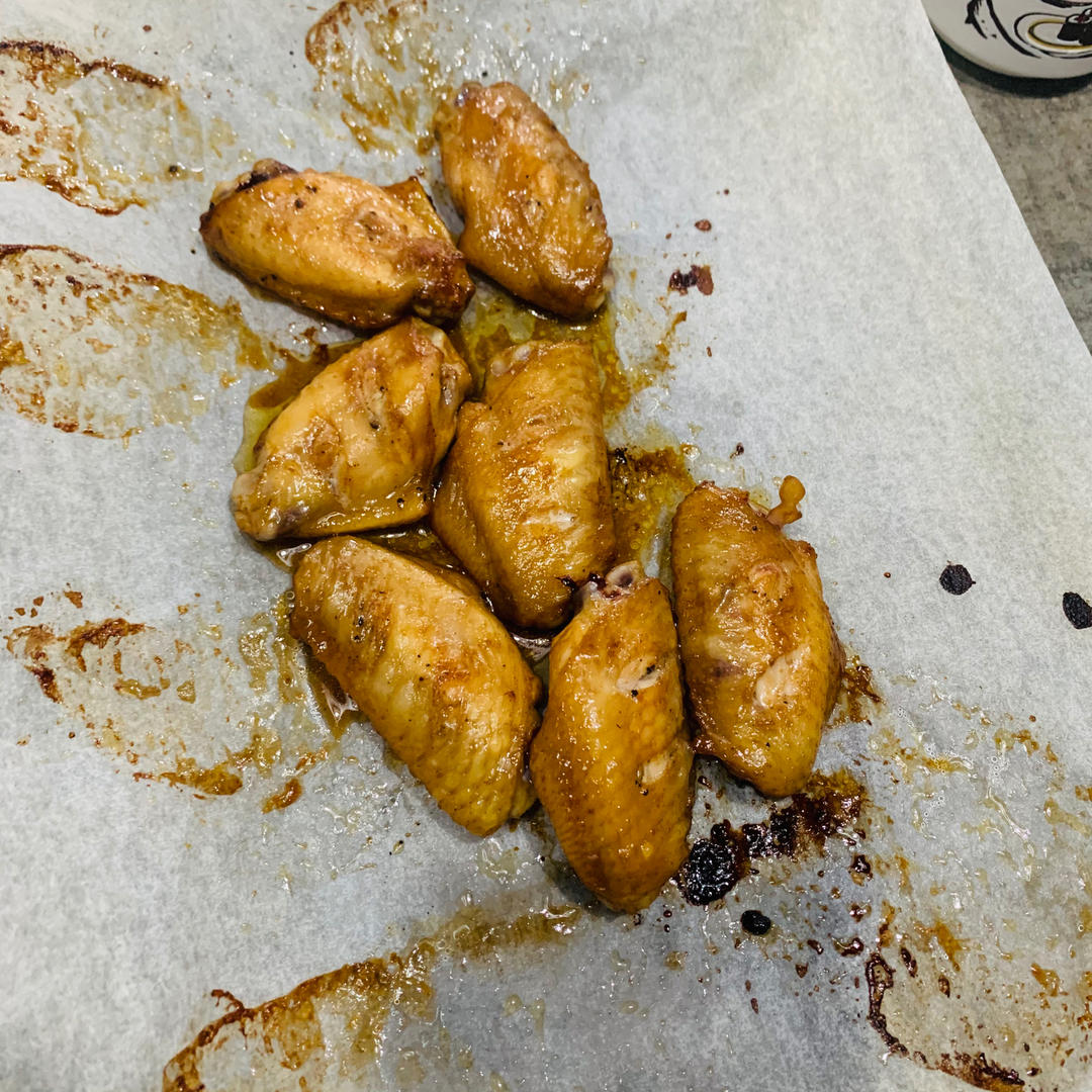 烘焙油纸变黑了的话,如果方便就再换一张,不方便更换就可以像我这样,刷蜂蜜水时顺便把鸡翅挪个地方。嘻嘻