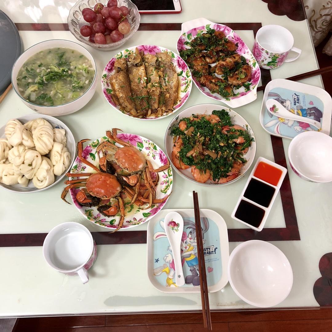 午餐:烤虾➕烤鸡翅➕蒸🦀️➕红烧🐟➕青菜肉汤➕蒸馒头(和他👩🏻一起吃饭)