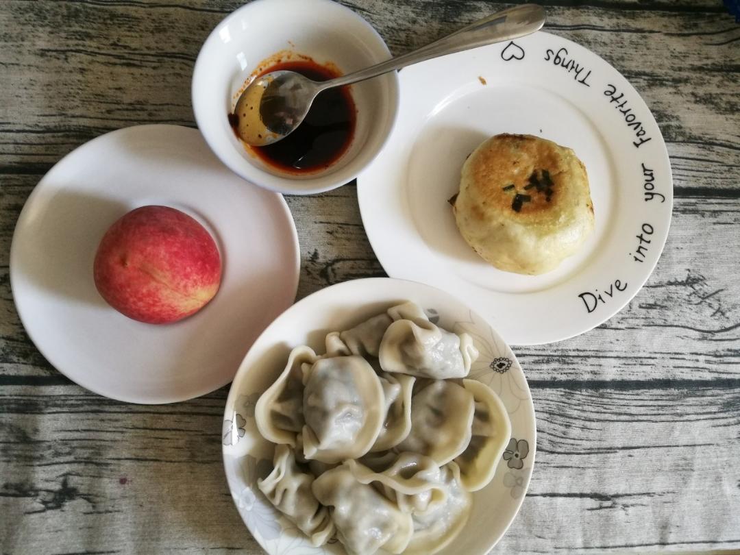 今天吃的有点多 水饺沾醋、水煎包、水蜜桃~
