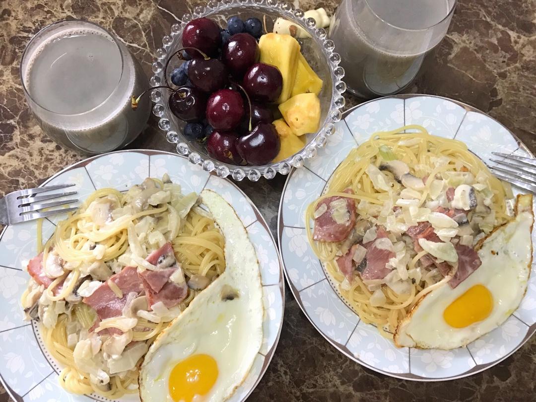 蘑菇培根白酱意粉+黑豆芝麻红枣豆浆+Cherry🍒+蓝莓+菠萝蜜