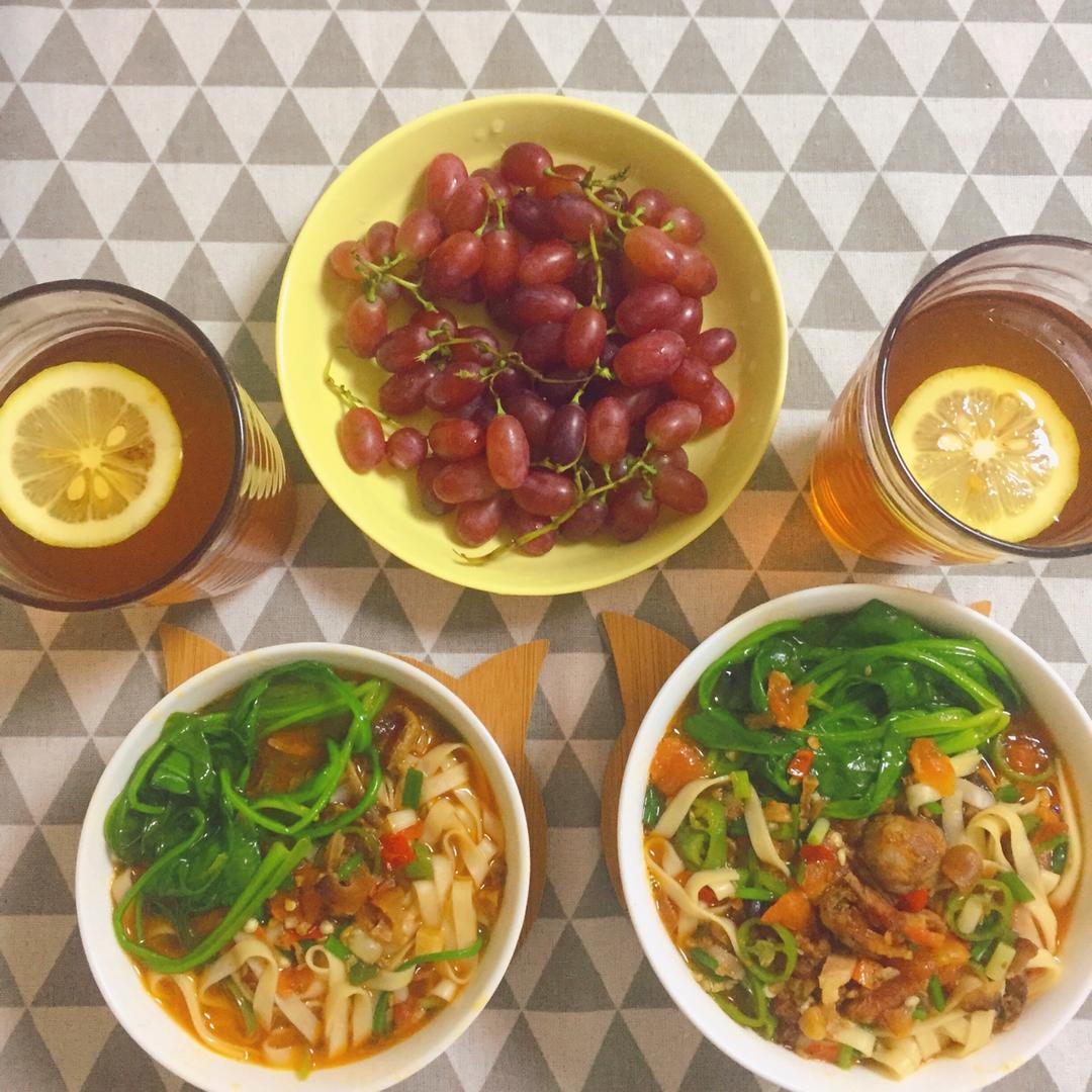 晚餐:腊肉菠菜面➕自制柠檬红茶➕葡萄